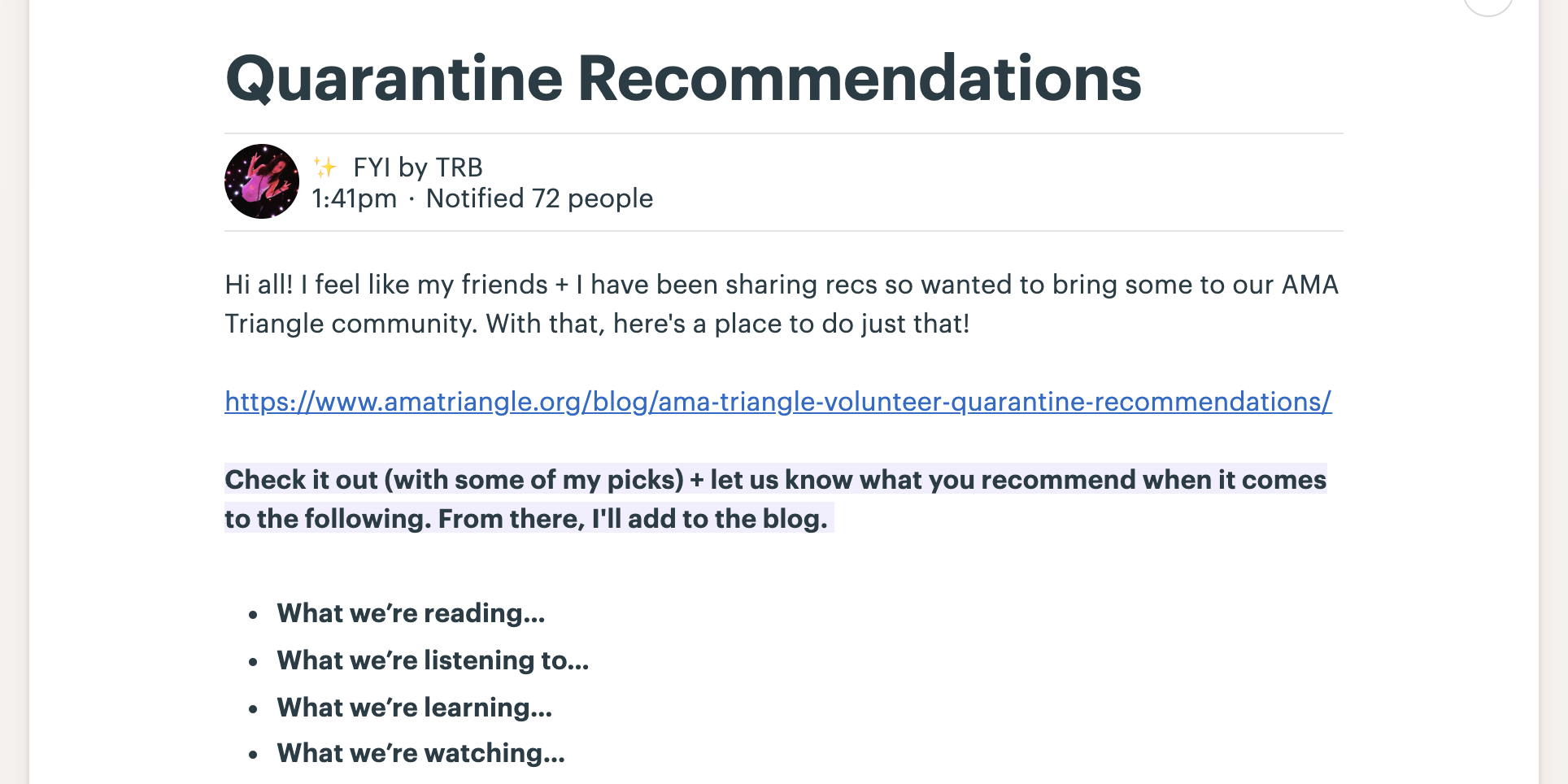 How is everyone? These are interesting times and please know team AMA Triangle is here for you. Our team is working to bring you more marketing content (think MANY more webinars, virtual meetups, our new Slack, etc.) but we’re all humans. And marketing isn’t on our mind 24/7. With that, presenting Quarantine recommendations from our team! We’ll continue to update as we find new resources…